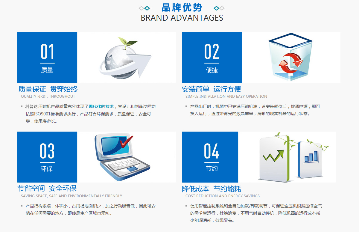 福州科普達機械有限公司,以ISO9001國際標準化質量認證體系整裝,確保為每一個用戶提供價值領先的壓縮空氣系統和技術服務,堅持創造空氣壓縮機領域的高端品質和高端價值!推出全系列高品質的節能變頻空壓機、雙螺桿式空壓機、活塞式空氣壓縮機以及壓縮空氣成套設備和系統服務。 科普達將以質量求生存,以科技創新求發展,以現代化管理求效益,堅持出精品、造品牌、創優質、守信譽,以客戶為上帝的宗旨,專注打造中國壓縮機領域中的航空級企業。福州科普達機械有限公司,以ISO9001國際標準化質量認證體系整裝,確保為每一個用戶提供價值領先的壓縮空氣系統和技術服務,堅持創造空氣壓縮機領域的高端品質和高端價值!推出全系列高品質的節能變頻空壓機、雙螺桿式空壓機、活塞式空氣壓縮機以及壓縮空氣成套設備和系統服務。 科普達將以質量求生存,以科技創新求發展,以現代化管理求效益,堅持出精品、造品牌、創優質、守信譽,以客戶為上帝的宗旨,專注打造中國壓縮機領域中的航空級企業。>>更多